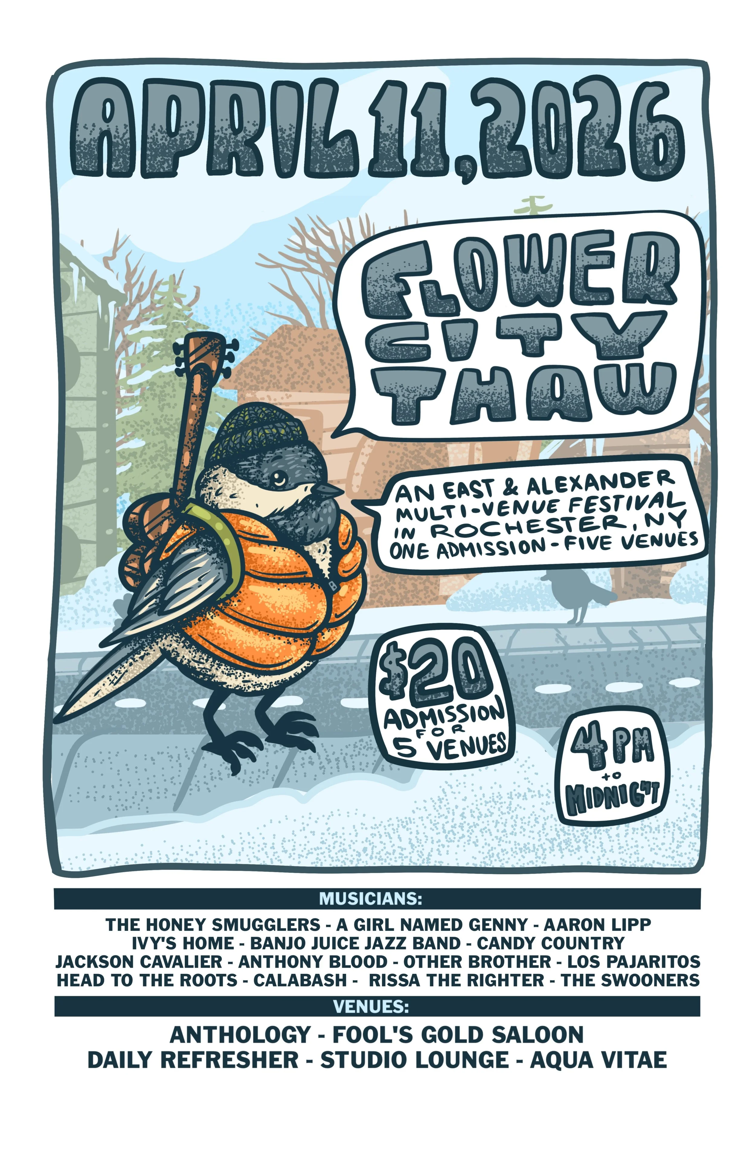 An East & Alexander multi-venue festival in Rochester NY, including the Daily Refresher, Studio Lounge, Fool’s Gold Saloon, Aqua Vitae & Anthology featuring music from A Girl Named Genny, Other Brother, Aaron Lipp, Banjo Juice Jazz Band, The Honey Smugglers, Los Pajaritos, Head to the Roots, The Swooners, Calabash, Rissa the Righter AND MORE